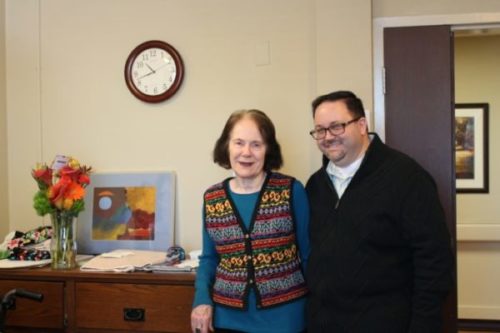 Wesley Place resident Judith Richelieu and Chicagoland Methodist Senior Services Director of Corporate Dining and Lifestyle Enrichment John Gould with RAF flowers and Judith’s own art.